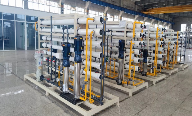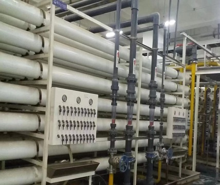 反滲透(RO膜系統)是60年代發展起來的一項新的薄膜分離技術,是依靠反滲透膜在壓力下使溶液中的溶劑與溶質進行分離的過程。對于除鹽系統來說,預處理水進入反滲透膜,在高壓力的作用下,小分子(如水分子)透過半透膜進入淡水室,大分子(如 Ca2+、Mg2+、Na+、SO42-、Cl-、HCO3-、HSiO3- 等離子)則留在濃水室,后排放。反滲透系統控制自動控制,根據程序進行過濾產水、加藥、停機沖洗。